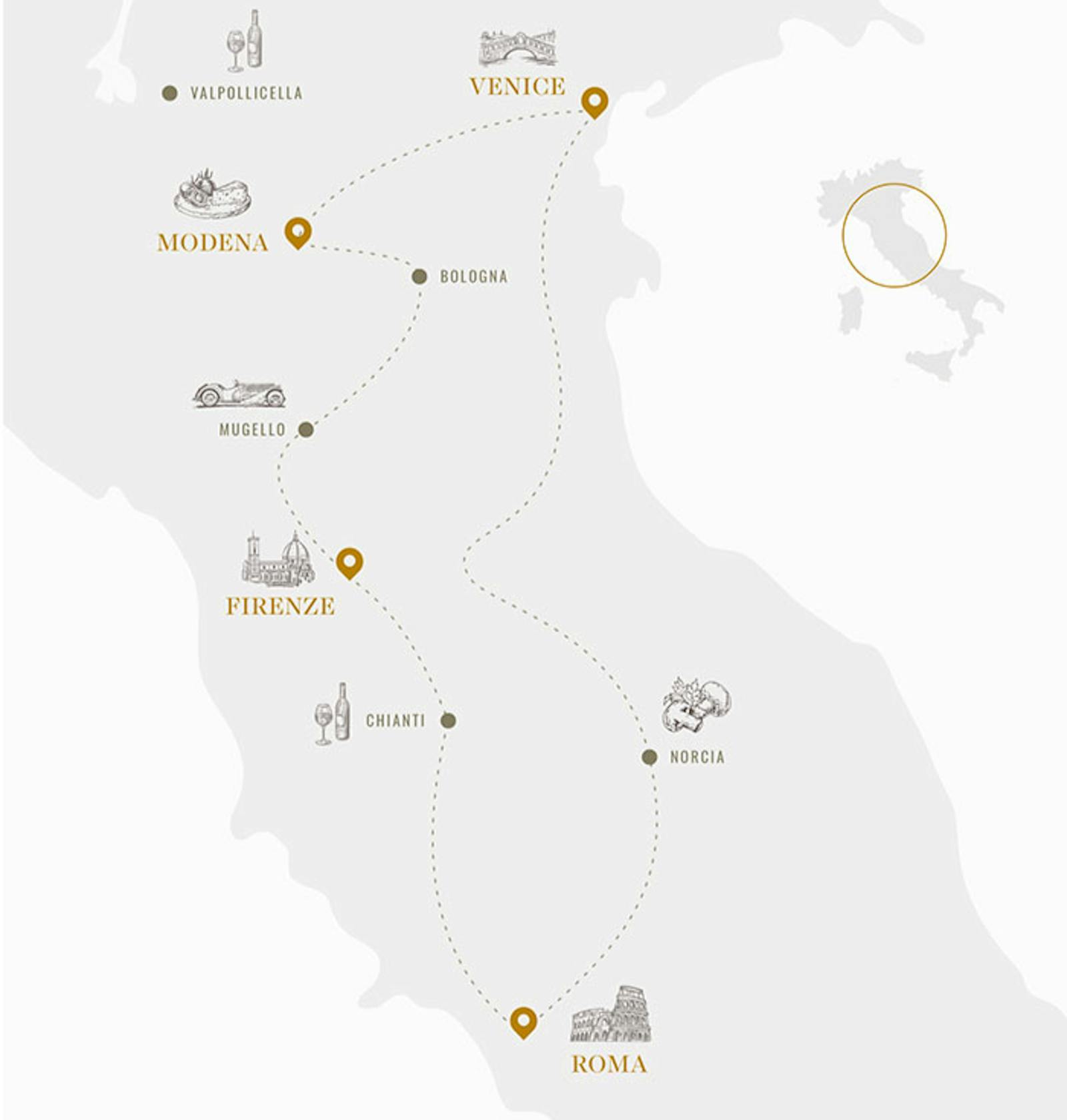 We want to revive the classic Grand Tour of Italy through classic cities, like Milan, Turin, Venice, Florence and Rome as a final destination.